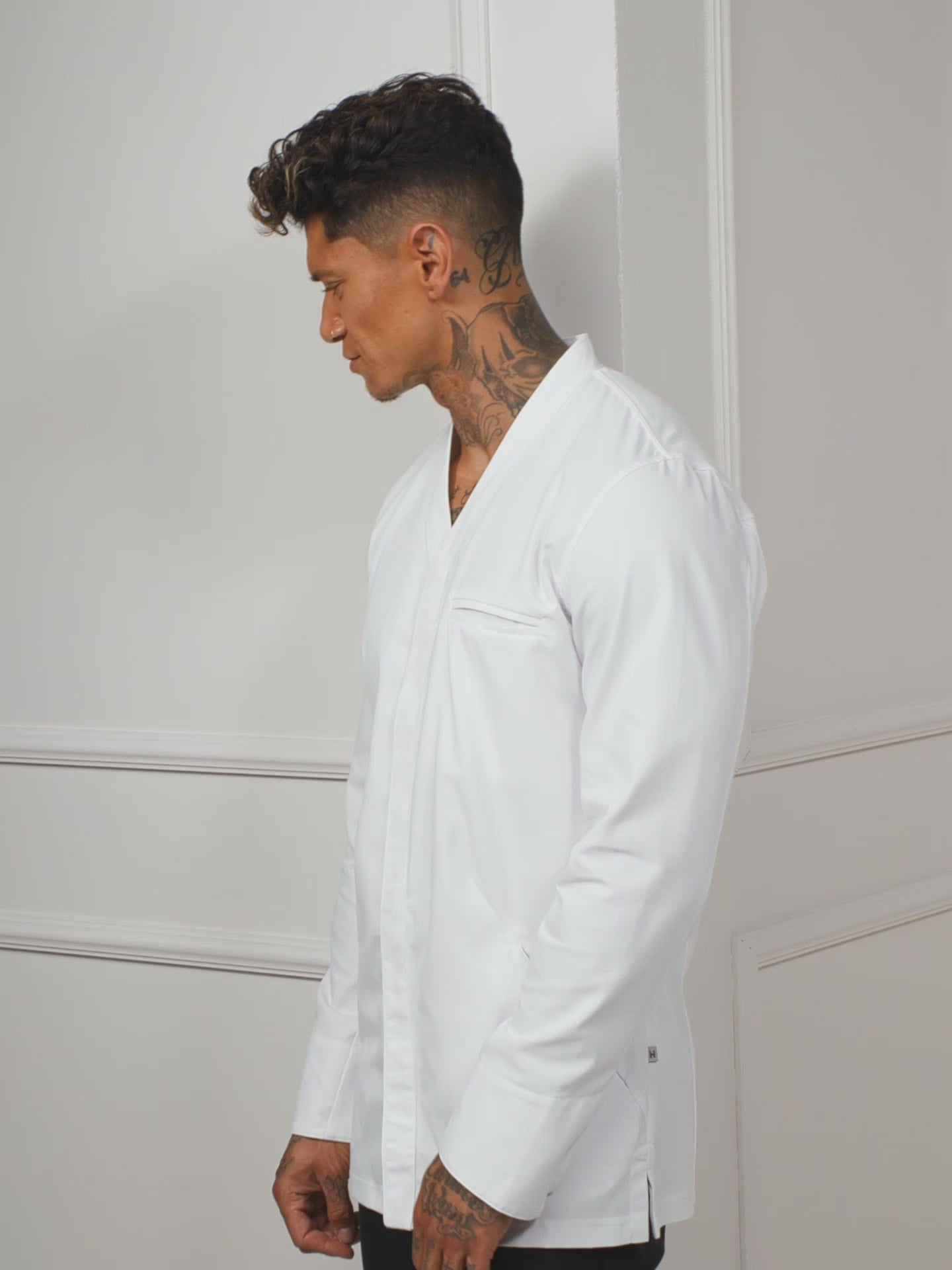 Esta chaqueta de chef de estilo asiático con cuello en V y bolsillos laterales está confeccionada con una lujosa tela de espiga y cumple con las más altas exigencias de la moda de chef.
