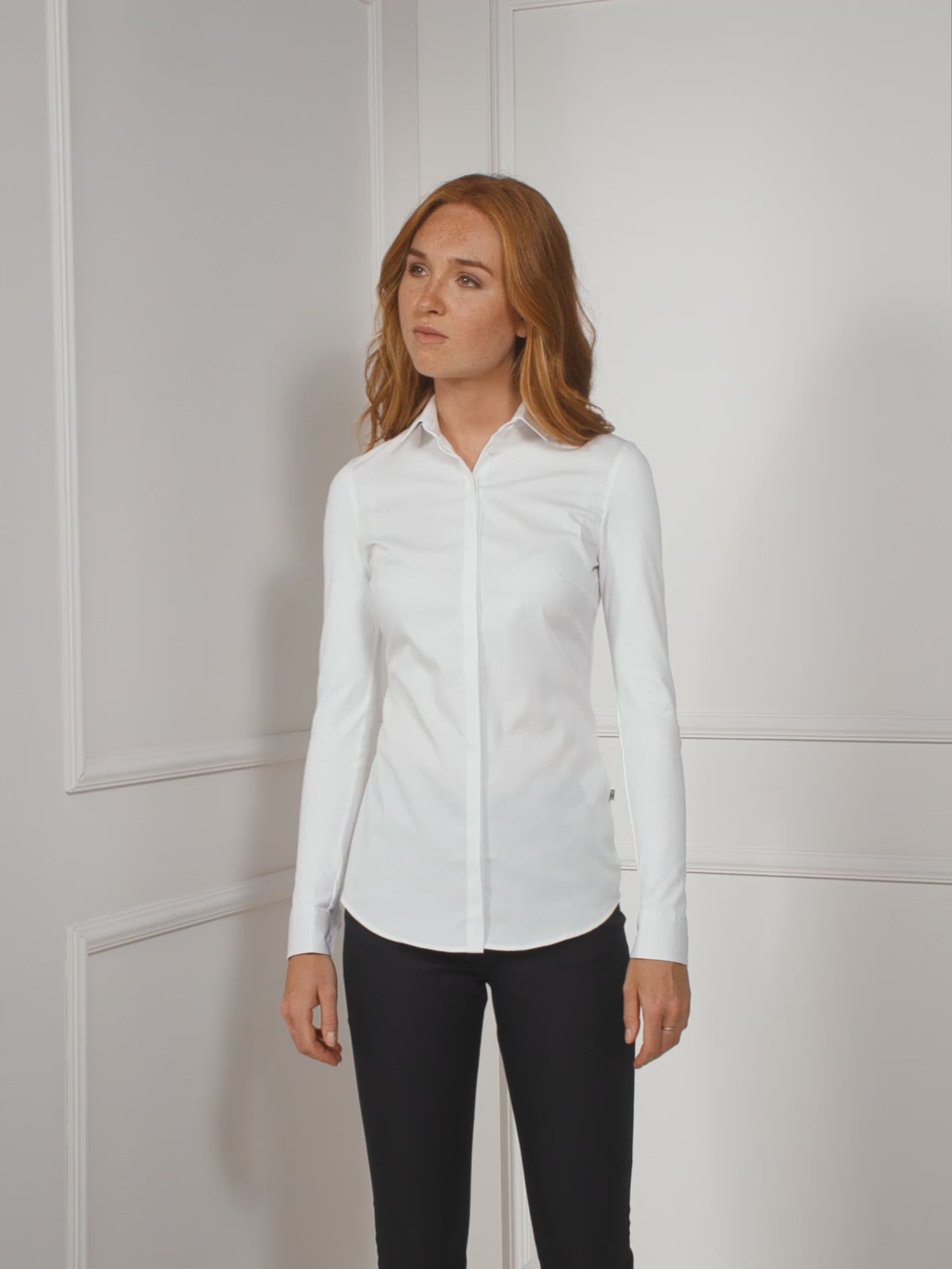 Una blusa clásica con un ajuste perfecto confeccionada en tejido elástico para máxima comodidad.