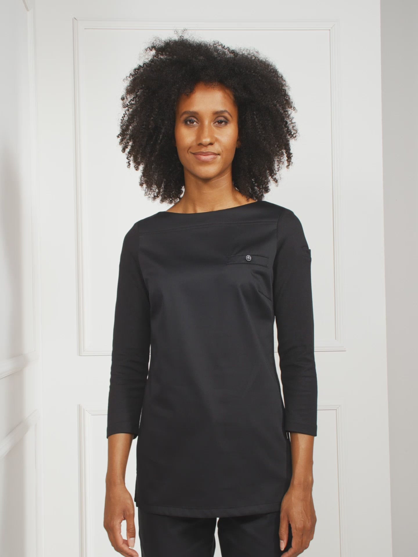 Esta chaqueta de chef para mujer con cuello barco da un aspecto moderno tanto a los empleados de cocina como a los de servicio.