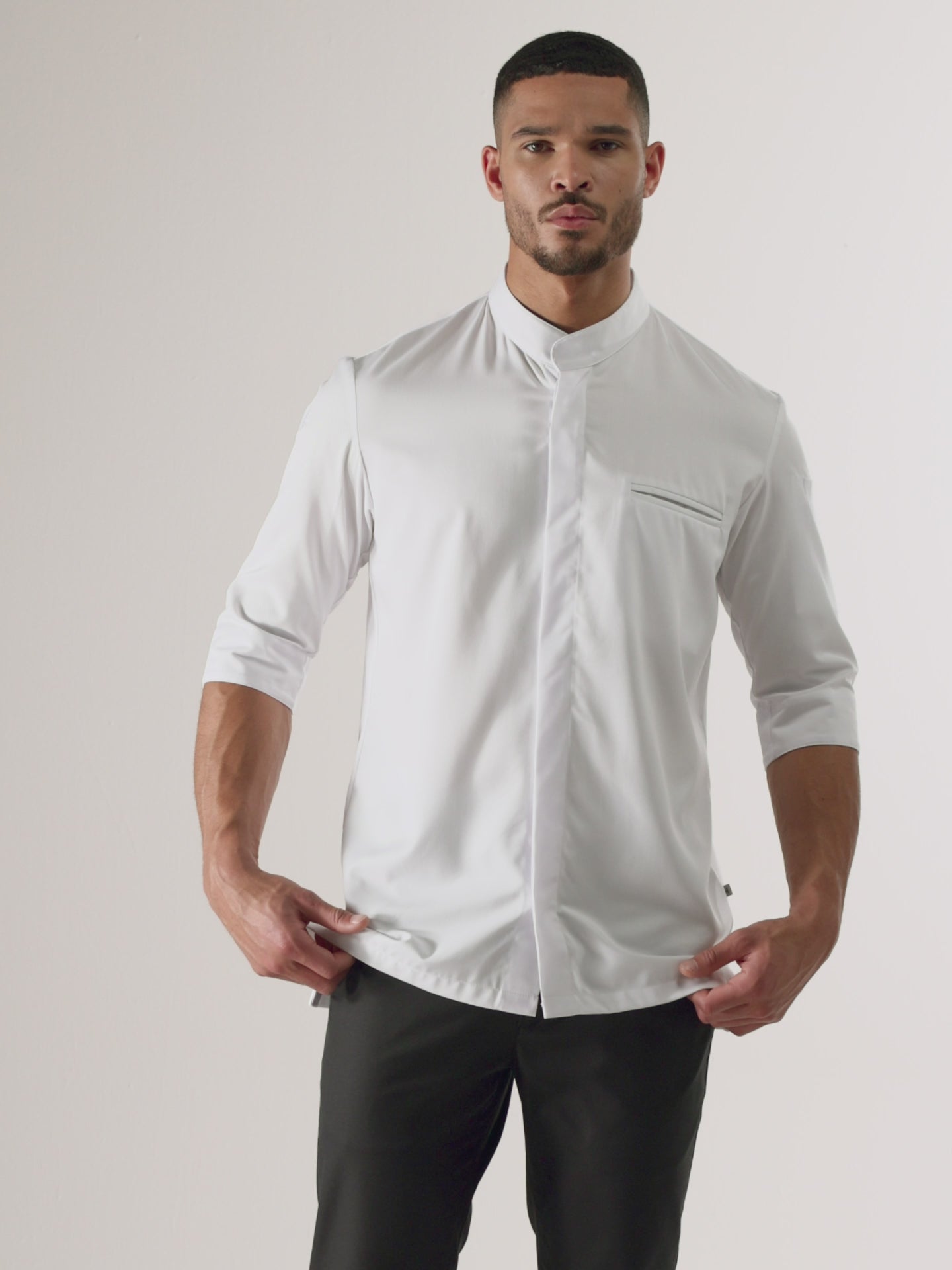 Con sus mangas 3/4, es una chaqueta de chef muy fresca, perfecta para llevar en ambientes cálidos. El exclusivo tejido elástico de la parte trasera de la chaqueta de chef es elástico en todas las direcciones.
