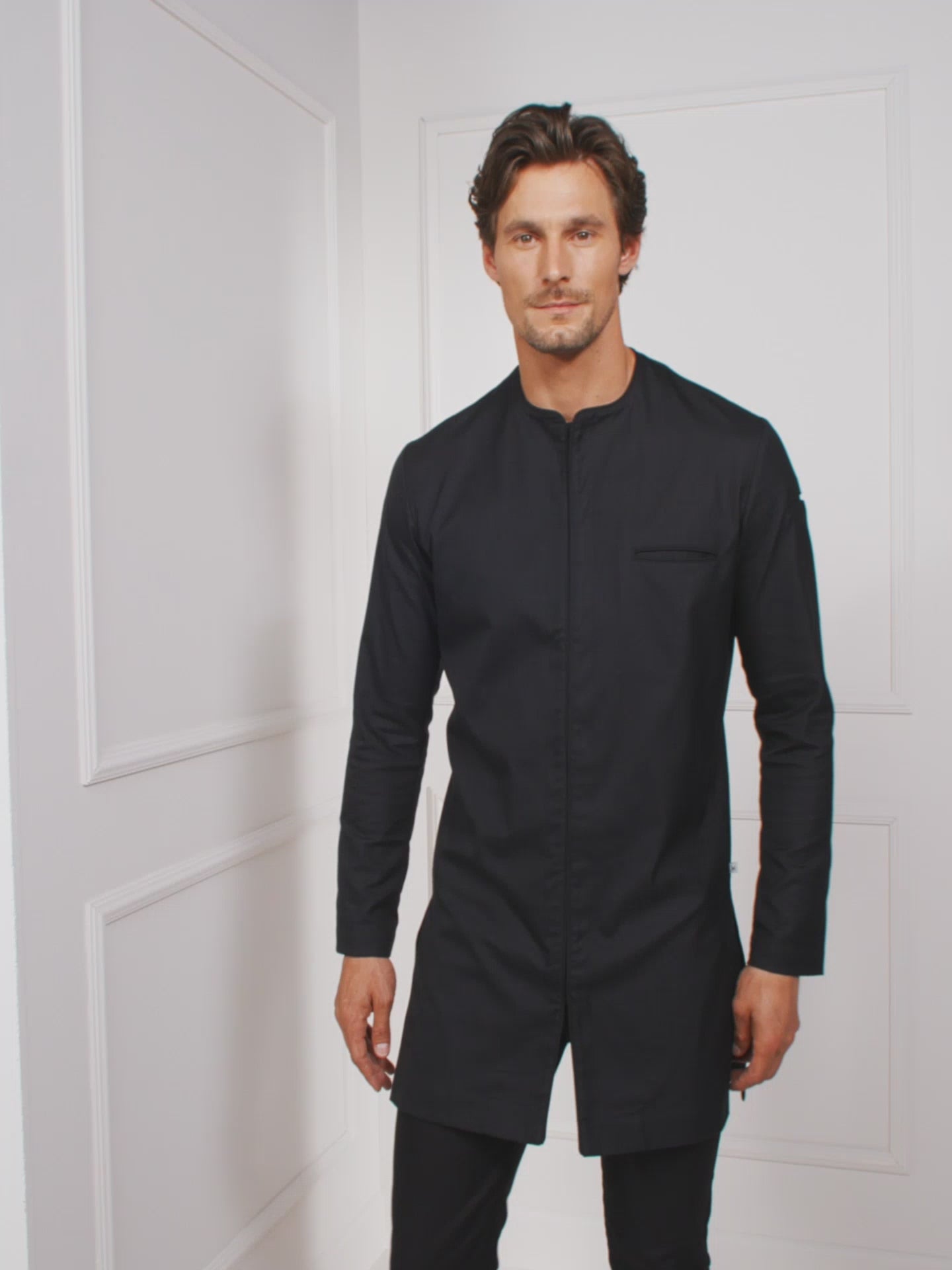 Una lujosa chaqueta de chef con cuello redondo, rematada con lujosos ribetes.
