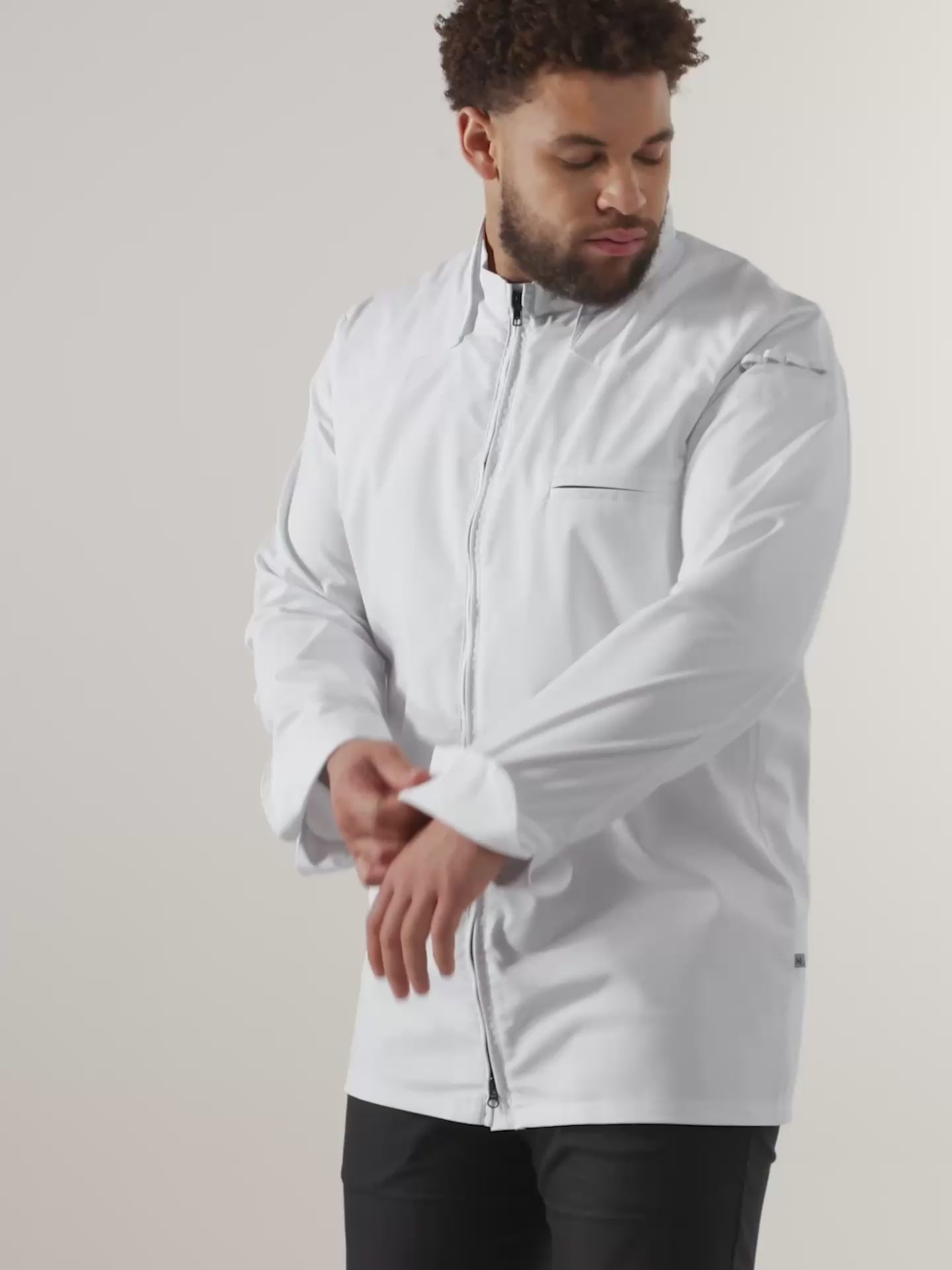 Una moderna chaqueta de chef blanca para hombre con doble cuello y cremallera bidireccional.