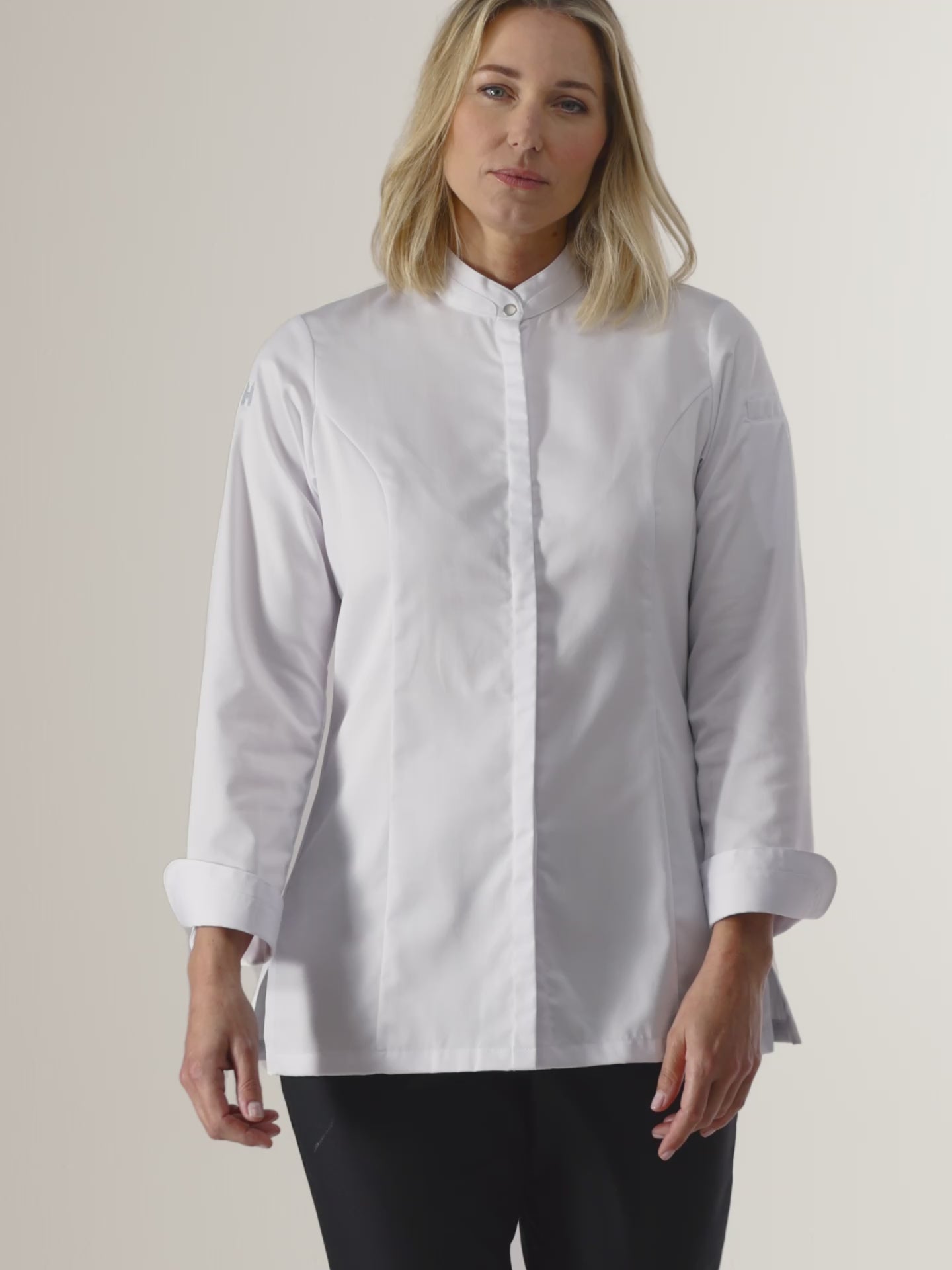 Una chaqueta de chef clásica de corte slim para mujer con tapeta oculta, mangas estrechas y abertura en ambos lados.